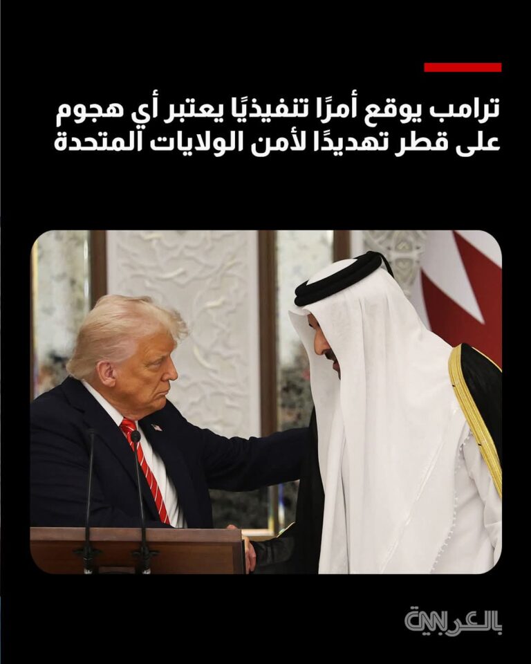 وكان ترامب وقع أمرا تنفيذيا، الاثنين، مُعلنا أن الولايات المتحدة تضمن أمن قطر، وستعتبر أي هجوم مسلح عليها تهديدا لأمريكا.